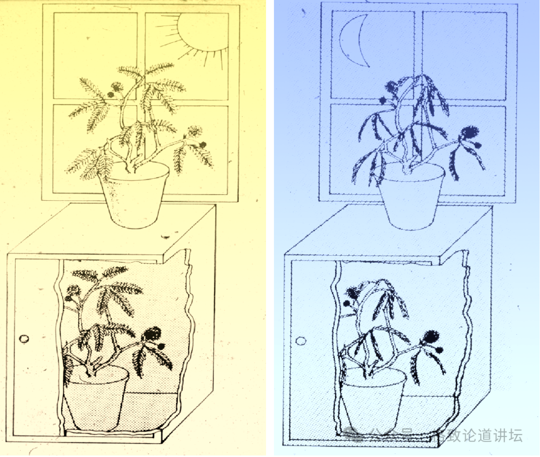 这里讲一个法国麦兰做的关键实验。大家都知道含羞草白天的时候叶子是打开的,到了晚上叶子会闭合,但很少有人专注细节,研究含羞草每天 24 小时经历的循环是不是光照启动的,所以麦兰设计了一个箱子,箱体是不透光的,他把含羞草放进去,结果发现含羞草在没有光照的情况下,白天时叶子是打开的。